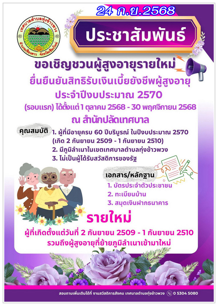 เรื่อง : ประกาศ แจ้งผู้สูงอายุที่มีอายุ 60 ปีในปีงบประมาณ 2570 ยื่นเอกสารเพื่อรับเงินเบี้ยยังชีพ |