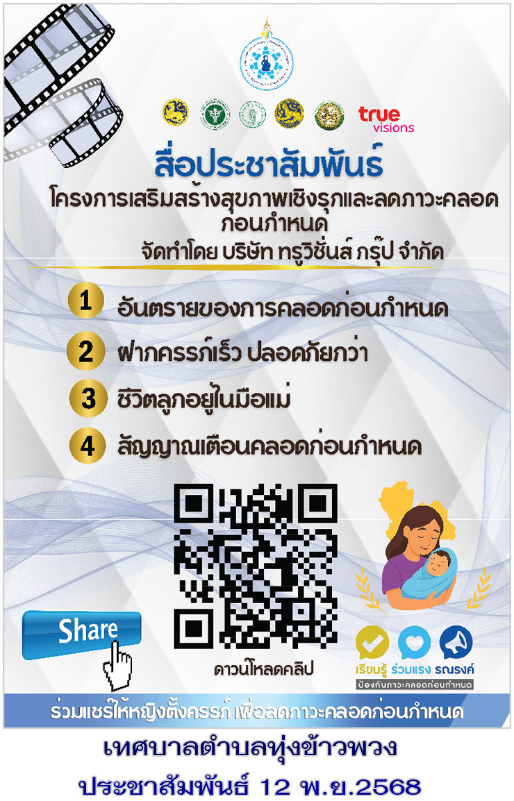 เทศบาลตำบลทุ่งข้าวพวงประชาสัมพันธ์ โครงการเสริมสร้างสุขภาพเชิงรุกและลดภาวะคลอดก่อนกำหนด จัดทำโดย บริษัท ทรูวิชั่นส์ กรุ๊ป จำกัด (รายละเอียด PDF) จึงประชาสัมพันธ์ - ประกาศเพื่อให้ทราบโดยทั่วกัน