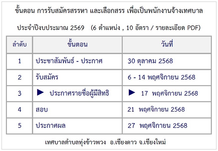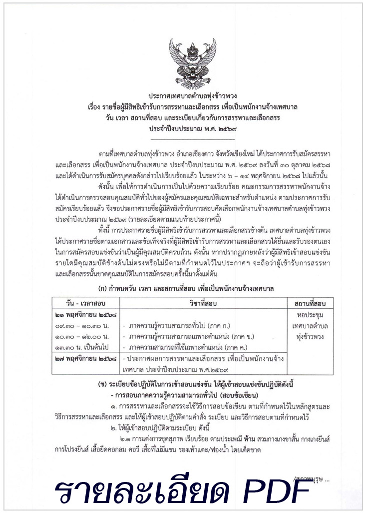 เรื่อง : ประกาศ รายชื่อผู้มีสิทธิสอบ เพื่อเป็นพนักงานจ้างเทศบาล ประจำปีงบประมาณ 2569 |