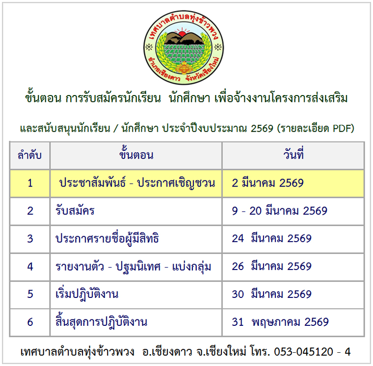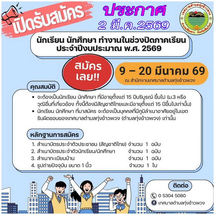 ประกาศ เรื่อง เทศบาลตำบลทุ่งข้าวพวง รับสมัครนักเรียน นักศึกษา เพื่อจ้างงานโครงการส่งเสริมและสนับสนุนนักเรียน / นักศึกษา ทำงานในช่วงปิดภาคเรียน ประจำปีงบประมาณ 2569 (รายละเอียด PDF) ![]() จึงประชาสัมพันธ์ - ประกาศเพื่อให้ทราบโดยทั่วกัน