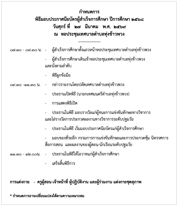 ทต.ทุ่งข้าวพวง ดำเนินพิธีมอบใบประกาศนียบัตร แด่ผู้สำเร็จการศึกษาระดับปฐมวัย และระดับประถมศึกษาปีที่ 6 ประจำปีการศึกษา 2568 แก่นักเรียนศูนย์พัฒนาเด็กเล็กในสังกัด และนักเรียนโรงเรียนในสังกัดเทศบาลตำบลทุ่งข้าวพวง และนิทรรศการแสดงผลงานของนักเรียน โดยมี นายศรีวอน บุญกองรัตน์ (นายกเทศมนตรีตำบลทุ่งข้าวพวง) เป็นประธานในพิธีเปิด , นางสาวทิพย์สุดา ชัยเมืองใจ (หัวหน้าสำนักปลัดเทศบาล รักษาราชการแทน ปลัดเทศบาลตำบลทุ่งข้าวพวง) เป็นผู้กล่าวรายงาน พร้อมด้วยคณะผู้บริหาร , สมาชิกสภาเทศบาล , ครูผู้สอน , ผู้ปกครองนักเรียน และเจ้าหน้าที่เทศบาล ฯ ร่วมงานดังกล่าว ณ หอประชุมเทศบาลตำบลทุ่งข้าวพวง อ.เชียงดาว จ.เชียงใหม่ ![]() ![]() ![]() ![]() ![]() ![]() สำนักงานเทศบาลตำบลทุ่งข้าวพวง