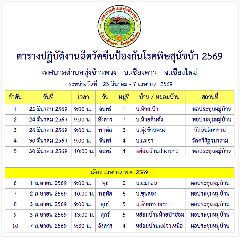 ประชาสัมพันธ์กำหนดการ แจ้งประชาชน เรื่อง การออกให้บริการฉีดวัคซีน ป้องกันโรคพิษสุนัขบ้าในสุนัขและแมว ในพื้นที่ตำบลทุ่งข้าวพวง โดยไม่มีค่าใช่จ่าย ระหว่างวันที่ 23 มีนาคม - 7 เมษายน 2569 จึงประชาสัมพันธ์ แจ้งให้ประชาชนในพื้นที่ตำบลทุ่งข้าวพวง เพื่อให้เตรียมการ และเพื่อให้ทราบโดยทั่วกัน (รายละเอียด PDF) ![]() จึงประชาสัมพันธ์ - ประกาศเพื่อให้ทราบโดยทั่วกัน