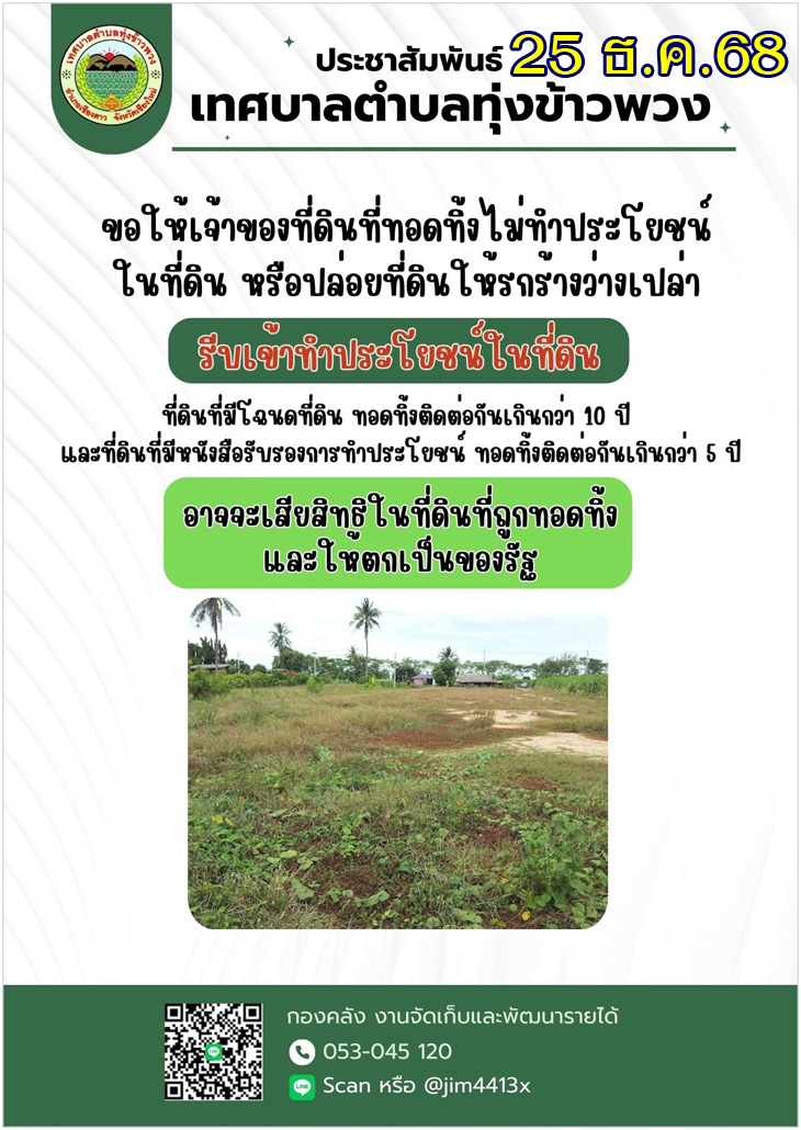 ทต.ทุ่งข้าวพวง ประชาสัมพันธ์ให้ผู้ครอบครองที่ดินรกร้างว่างเปล่า ให้เข้าทำประโยชน์ในที่ดิน (รายละเอียด PDF) ติดต่อสอบถามเพิ่มเติม งานจัดเก็บและพัฒนารายได้ ทต.ทุ่งข้าวพวง โทรศัพท์ 053-045120 - 2 , 053-045080 จึงประชาสัมพันธ์ - ประกาศเพื่อให้ทราบโดยทั่วกัน