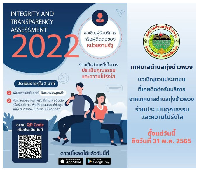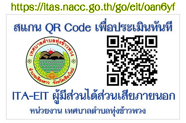 เทศบาลตำบลทุ่งข้าวพวง ขอเชิญชวนประชาชนผู้มีส่วนได้เสียร่วมประเมินคุณธรรมและความโปร่งใสในการดำเนินงาน ของเทศบาลตำบลทุ่งข้าวพวง (Integrity and Transparency Assessment: ITA) ประจำปีงบประมาณ พ.ศ. 2565 โดยสามารถเข้าไปประเมินแบบวัดการรับรู้ผู้มีส่วนได้ส่วนเสียภายนอก (แบบ EIT) ต่อการปฏิบัติงานของเทศบาลตำบลทุ่งข้าวพวง โดยเป็นการตอบแบบสอบถามใน 3 ตัวชี้วัด ประเมินง่ายๆ ใน 3 นาที เพียงเข้าไปที่ Link : https://itas.nacc.go.th/go/eit/oan6yf หรือ สแกน QR Code ด้านล่าง ตั้งแต่วันที่ 1 มีนาคม - 31 พฤษภาคม 2565 จึงประชาสัมพันธ์ - ประกาศเพื่อให้ทราบโดยทั่วกัน
