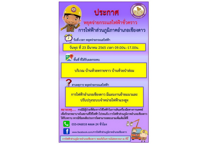 แจ้งตัดกระแสไฟฟ้า เพื่อดำเนินการซ่อมแซมปรับปรุงระบบ มีผลกระทบให้พื้นที่ บ้านห้วยทรายขาว และ หย่อมบ้านห้วยป่าฮ่อม หมู่ 5 ไม่มีกระแสไฟฟ้าใช้ ในวันพุธที่ 23 มีนาคม 2565 เวลา 09.00 น. - 17.00 น. จึงประชาสัมพันธ์ แจ้งให้ประชาชนในพื้นที่ บ้านห้วยทรายขาว และ หย่อมบ้านห้วยป่าฮ่อม หมู่ 5 ให้ทราบล่วงหน้า หากมีข้อสงสัยโปรดติดต่อ การไฟฟ้าส่วนภูมิภาคสาขาเชียงดาว โทร. 053 - 046818 จึงประชาสัมพันธ์ - ประกาศเพื่อให้ทราบโดยทั่วกัน