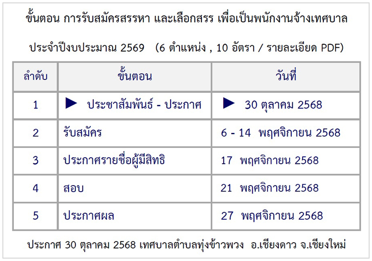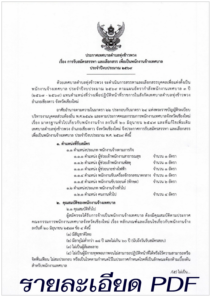 ประกาศ เทศบาลตำบลทุ่งข้าวพวง (รายละเอียด PDF) เรื่อง การรับสมัครสรรหา และเลือกสรร เพื่อเป็นพนักงานจ้างเทศบาล ประจำปีงบประมาณ 2569 (6 ตำแหน่ง รวม 10 อัตรา) สอบถามเพิ่มเติม เทศบาลตำบลทุ่งข้าวพวง โทรศัพท์ 053-045120 - 2 , 053-045080 1. ตำแหน่ง ผู้ช่วยเจ้าพนักงานสาธารณสุข จำนวน 1 อัตรา 2. ตำแหน่ง ผู้ช่วยเจ้าพนักงานพัสดุ จำนวน 1 อัตรา 3. ตำแหน่ง ผู้ช่วยนายช่างไฟฟ้า จำนวน 1 อัตรา 4. ตำแหน่ง พนักงานขับเครื่องจักรกลขนาดกลาง จำนวน 1 อัตรา 5. ตำแหน่ง พนักงานขับรถยนต์ (ทักษะ) จำนวน 2 อัตรา 6. ตำแหน่ง คนงานทั่วไป จำนวน 4 อัตรา ![]()      จึงประชาสัมพันธ์ - ประกาศเพื่อให้ทราบโดยทั่วกัน