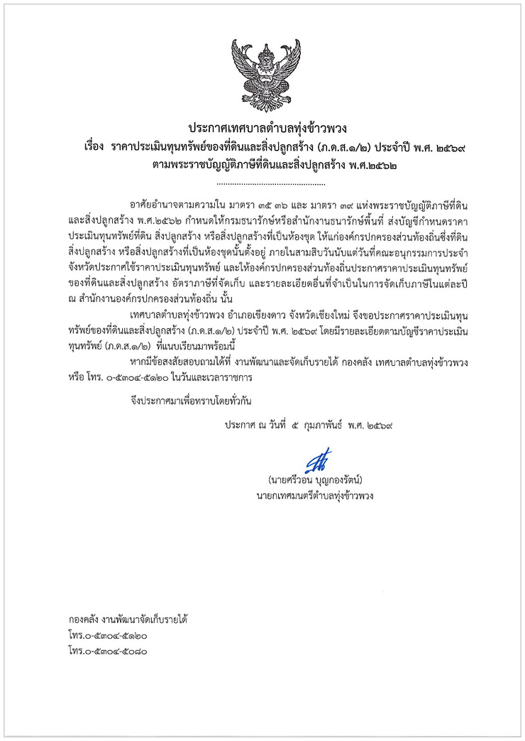 เรื่อง : ประกาศ ราคาประเมินทุนทรัพย์ของที่ดินและสิ่งปลูกสร้าง (ภ.ด.ส.1/2) ประจำปี พ.ศ.2569 |