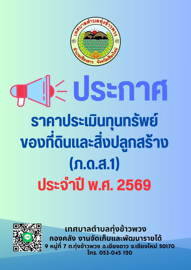ประกาศเทศบาลตำบลทุ่งข้าวพวง เรื่อง ราคาประเมินทุนทรัพย์ของที่ดินและสิ่งปลูกสร้าง (ภ.ด.ส.1/2) ประจำปี พ.ศ.2569 ตามพระราชบัญญัติภาษีที่ดินและสิ่งปลูกสร้าง พ.ศ.2562 (รายละเอียด PDF) หากมีข้อสงสัย สอบถามเพิ่มเติมได้ที่ งานพัฒนาและจัดเก็บรายได้ กองคลัง เทศบาลตำบลทุ่งข้าวพวง โทรศัพท์ 0-5304-5120 ในวัน เวลาราชการ ![]() จึงประชาสัมพันธ์ - ประกาศเพื่อให้ทราบโดยทั่วกัน
